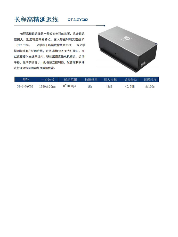 长程高精延迟线是一种改变光程的装置,具备延迟范围大,延迟精度高的特点,在太赫兹时域光谱技术(THZ-TDS), 光学相干断层成像技术(OCT) 等光学探测领域有广泛的应用;对外采用FC/APC光纤接口,可以直接接入光纤系统内。驱动采用直线电机模组,运行平稳,振动及噪音小,配备独立控制器,配套控制软件进行延迟线范围调整及数据传输。