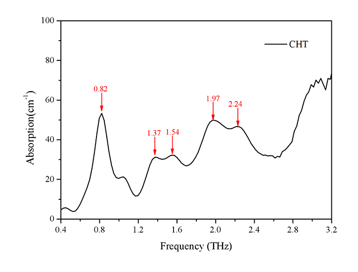 随着时代的进步,药品的研发速度也越来越快,市场上药品的种类也越来越多。医疗事业的发展一方面提升了我国的医疗水平,但是另一方面也带来了新的药品安全问题。为了提高药品的安全,就必须要对药品进行严格的质量检测,以此来保障药品的质量。但是,由于一些现实原因,目前药品检测还存在很多的缺陷,药品检测的质量不高,而这也导致了药品市场的混乱,影响着大众的用药安全。太赫兹波的频谱范围对应很多大分子的振动与转动能级,不同物质在太赫兹波段都具有其唯一的特征吸收峰,可以以此对很多药品中特定物质进行定性与定量检测。下图为几丁质(CHT)在太赫兹波段吸收系数的实测值,可以看到其在0.82THz、1.37 THz、1.54。