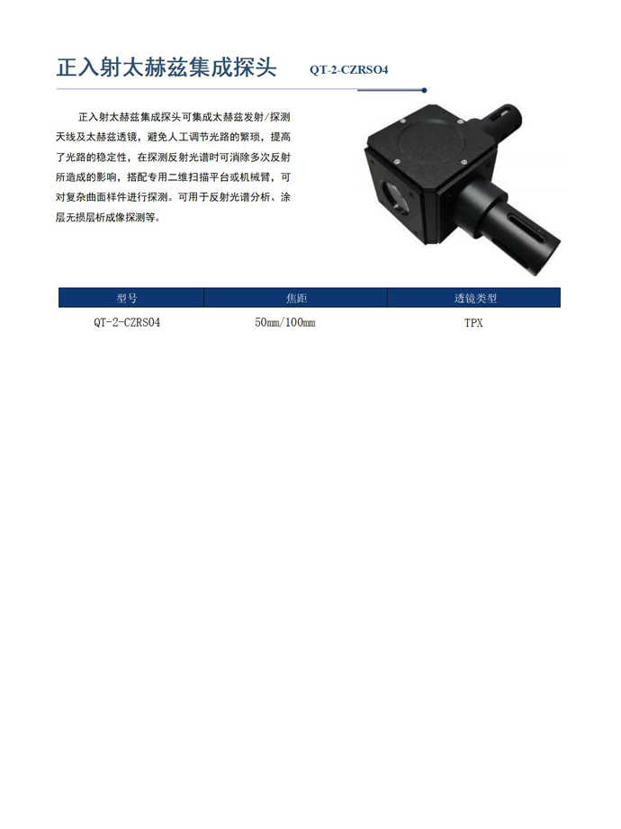 正入射太赫兹集成探头可集成太赫兹发射/探测天线及太赫兹透镜,避免人工调节光路的繁琐,提高了光路的稳定性,在探测反射光谱时可消除多次反射所造成的影响,搭配专用二维扫描平台或机械臂,可对复杂曲面样件进行探测。可用于反射光谱分析、涂层无损层析成像探测等。