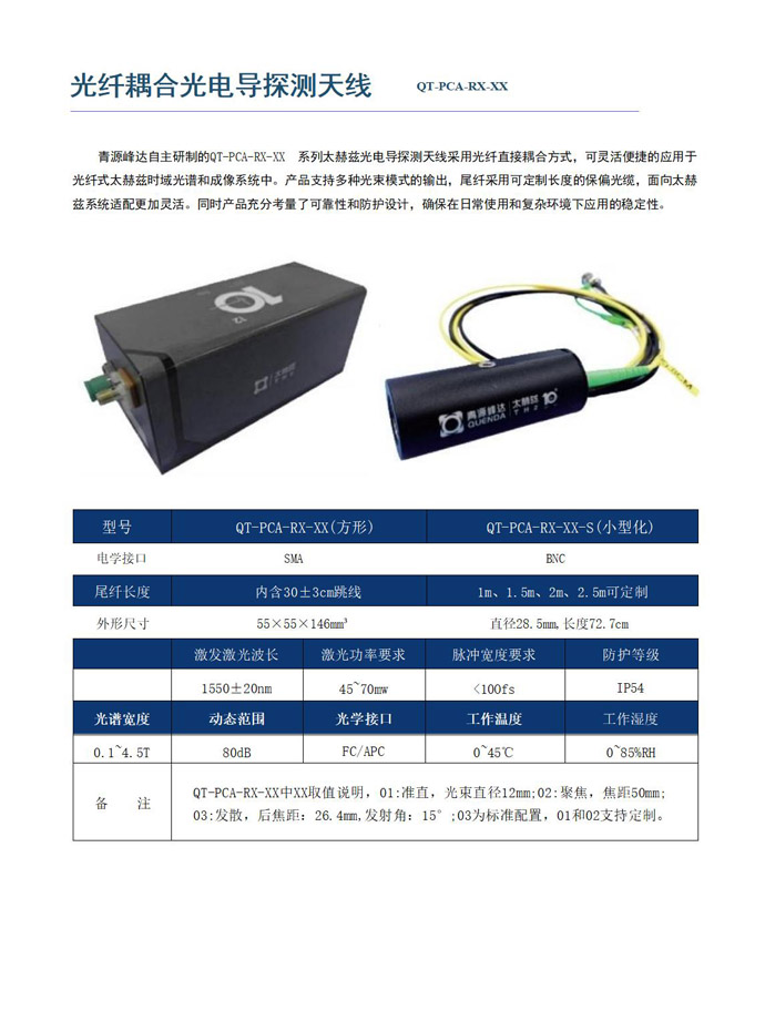 青源峰达自主研制的QT-PCA-RX-XX系列太赫兹光电导探测天线采用光纤直接耦合方式,可灵活便捷的应用于光纤式太赫兹时域光谱和成像系统中。产品支持多种光束模式的输出,尾纤采用可定制长度的保偏光缆,面向太赫兹系统适配更加灵活。同时产品充分考量了可靠性和防护设计,确保在日常使用和复杂环境下应用的稳定性。