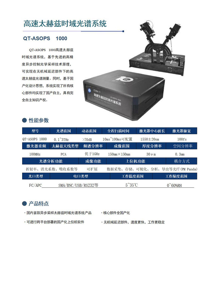 QT-ASOPS1000高速太赫兹时域光谱系统,基于先进的高精度异步控制光学采样技术原理, 可实现在无机械延迟部件下的高速太赫兹光谱测量。同时,基于国产化设计思想,系统实现了所有核心部件均实现了国产自主,具有完全自主知识产权。